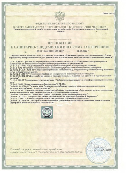 Санитарно-эпидемиологическое заключение. Приложение (скачать) (посмотреть)